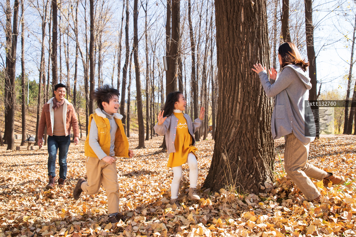 图片标题: 欢乐家庭在户外玩捉迷藏游戏