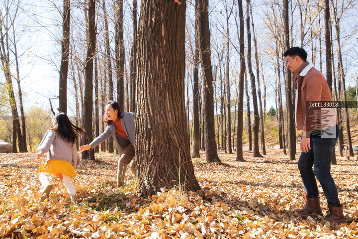 图片标题: 欢乐家庭在户外玩捉迷藏游戏