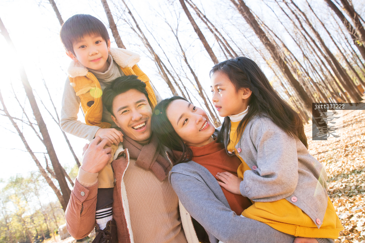 图片标题: 幸福家庭在树林里玩耍