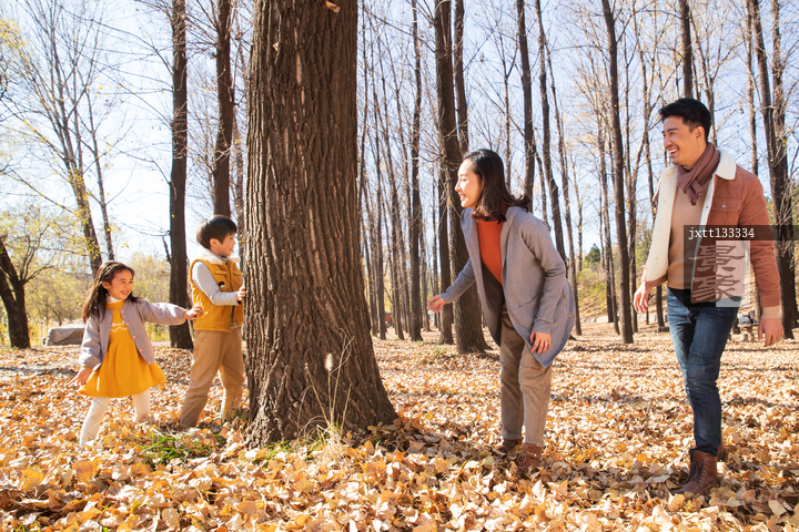 图片标题: 欢乐家庭在户外玩捉迷藏游戏
