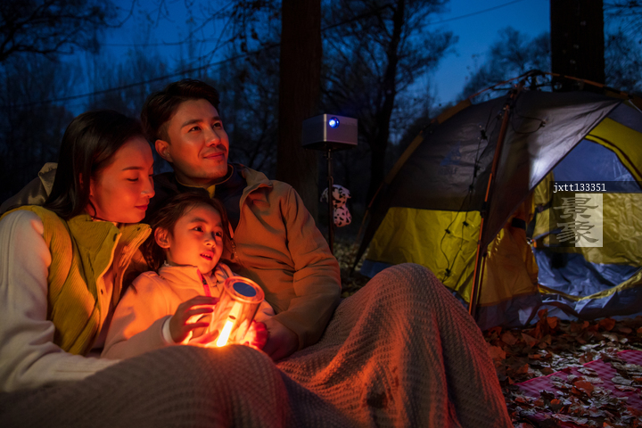 图片标题: 一家三口夜晚在野外露营