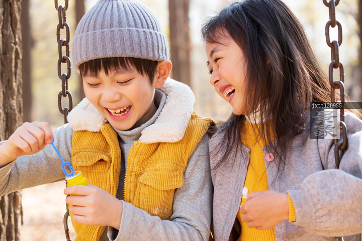 图片标题:     快乐儿童坐在秋千上吹泡泡
