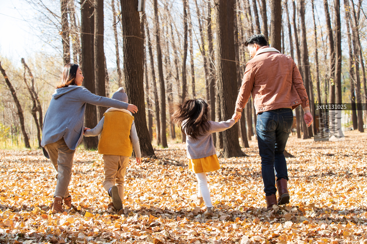 图片标题: 快乐家庭走在树林里