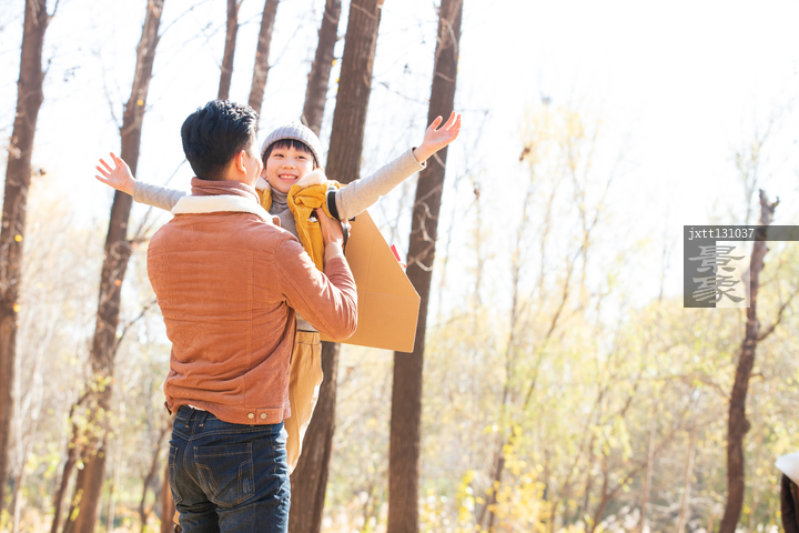 图片标题: 年轻父亲抱着孩子玩飞机游戏