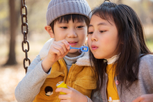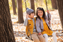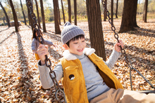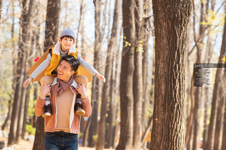 图片标题: 年轻父亲背着孩子玩飞机游戏