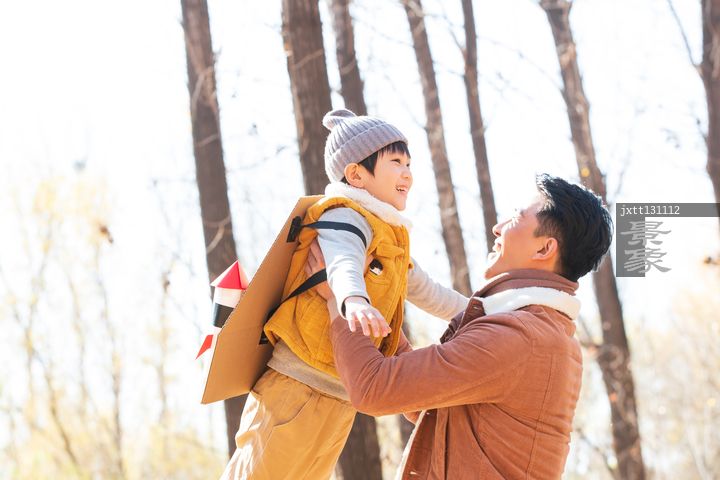 图片标题:     年轻父亲抱着孩子玩飞机游戏