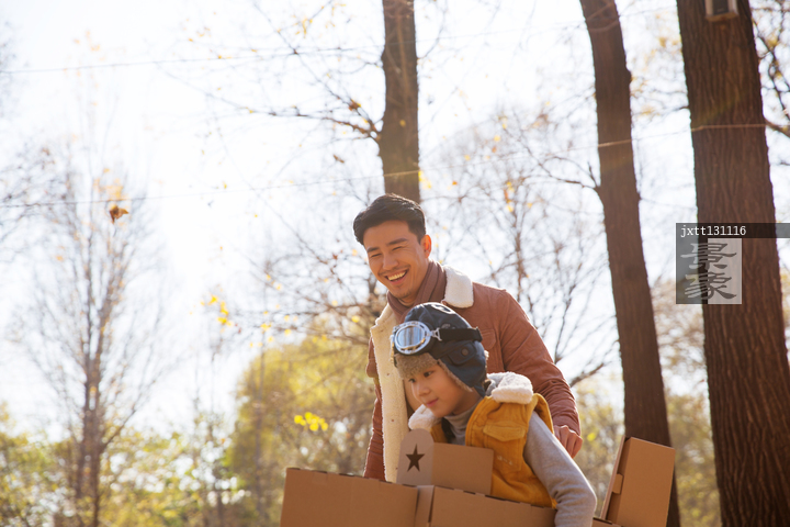 图片标题: 年轻父亲带着孩子玩飞机游戏