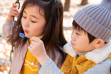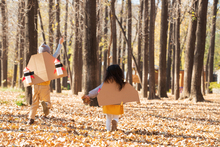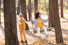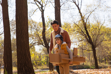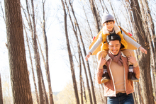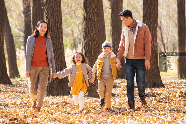 图片标题: 快乐家庭走在树林里