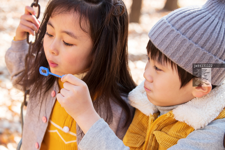 图片标题: 快乐儿童坐在秋千上吹泡泡