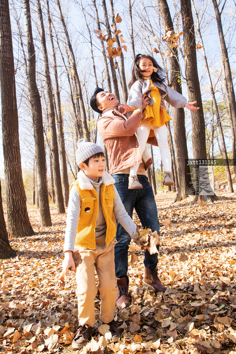图片标题:     青年父亲带着孩子们在树林里玩耍