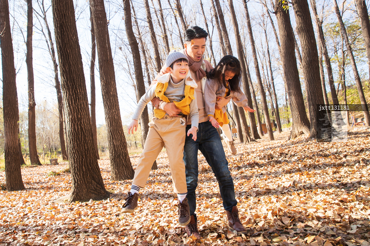 图片标题: 青年父亲带着孩子们在树林里玩耍