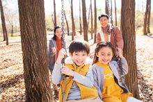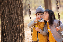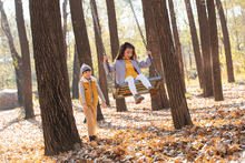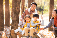 图片标题: 快乐儿童坐在秋千上吹泡泡