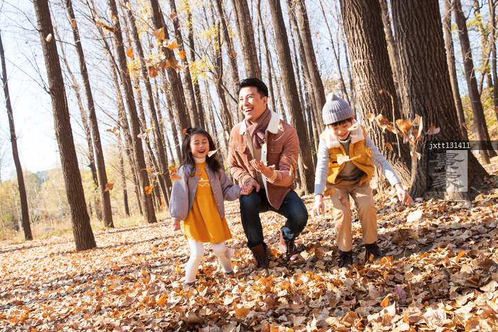 图片标题: 青年父亲带着孩子们在树林里玩耍