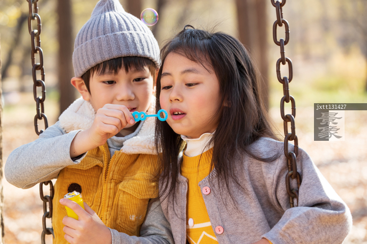 图片标题: 快乐儿童坐在秋千上吹泡泡