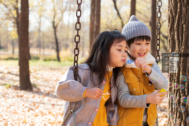 图片标题: 快乐儿童坐在秋千上吹泡泡
