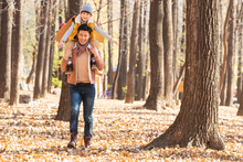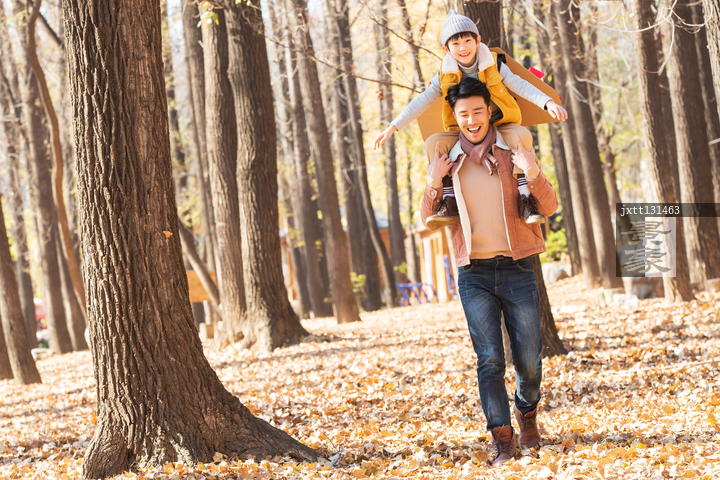 图片标题: 年轻父亲背着孩子玩飞机游戏