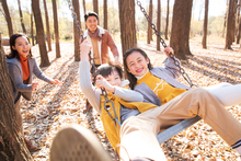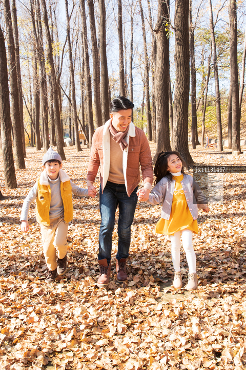 图片标题:     青年父亲带着孩子们在树林里玩耍