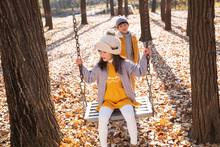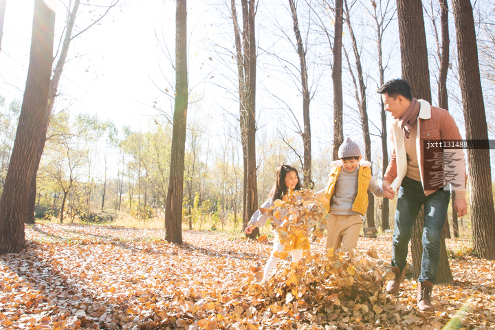 图片标题: 青年父亲带着孩子们在树林里玩耍