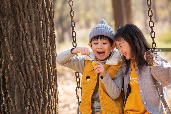 图片标题: 快乐儿童坐在秋千上吹泡泡
