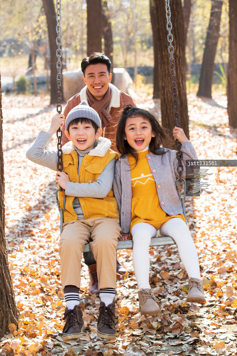 图片标题: 青年父亲推着孩子荡秋千