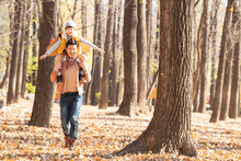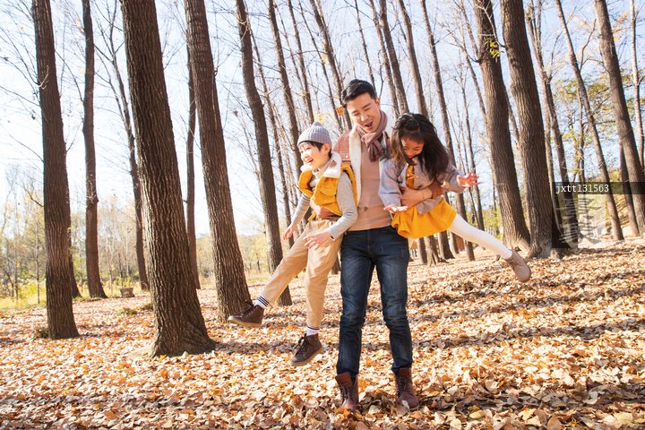 图片标题: 青年父亲带着孩子们在树林里玩耍