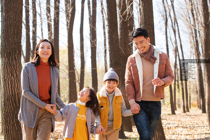 图片标题: 快乐家庭走在树林里