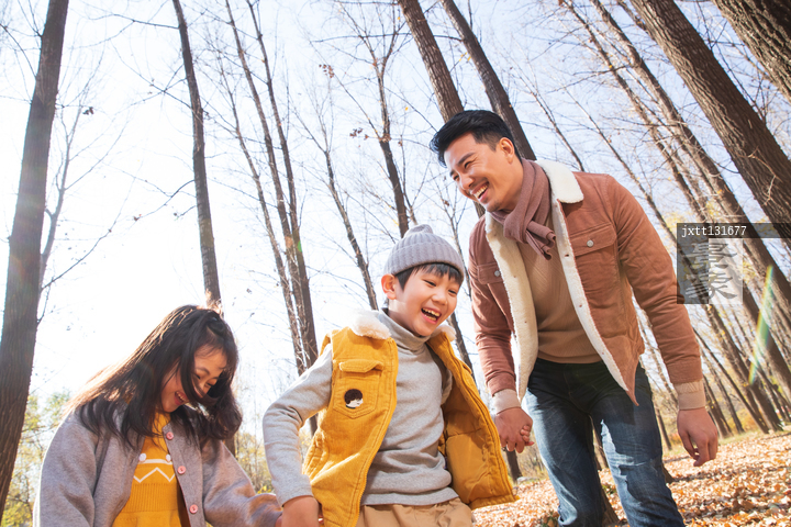 图片标题: 青年父亲带着孩子们在树林里玩耍