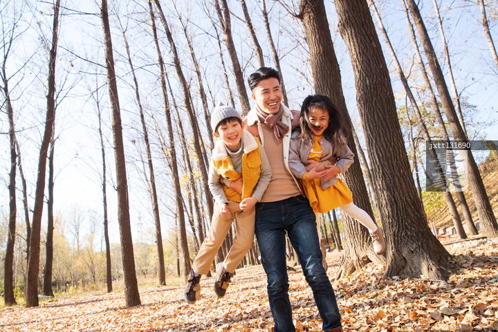 图片标题:     青年父亲带着孩子们在树林里玩耍