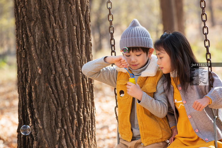 图片标题: 快乐儿童坐在秋千上吹泡泡