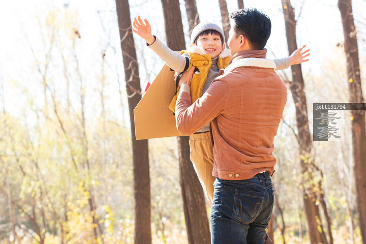 图片标题: 年轻父亲抱着孩子玩飞机游戏