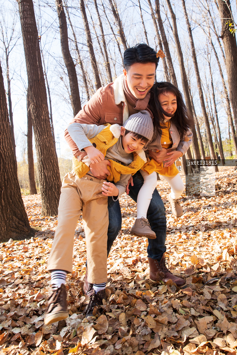 图片标题:     青年父亲带着孩子们在树林里玩耍