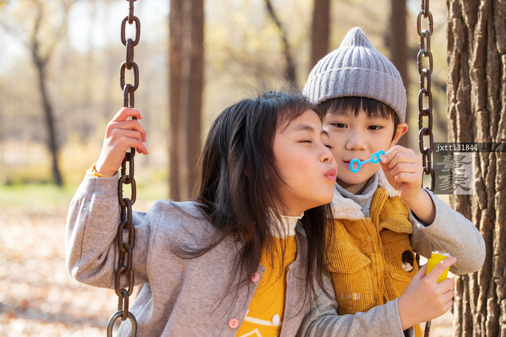 图片标题: 快乐儿童坐在秋千上吹泡泡