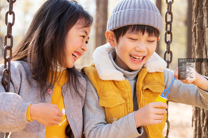图片标题: 快乐儿童坐在秋千上吹泡泡