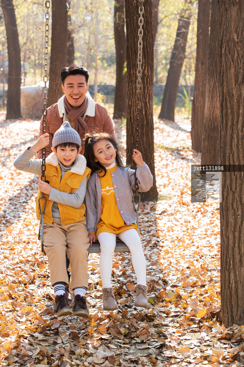 图片标题: 青年父亲推着孩子荡秋千