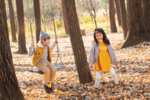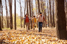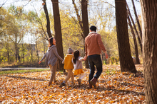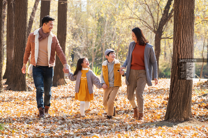 图片标题: 快乐家庭走在树林里