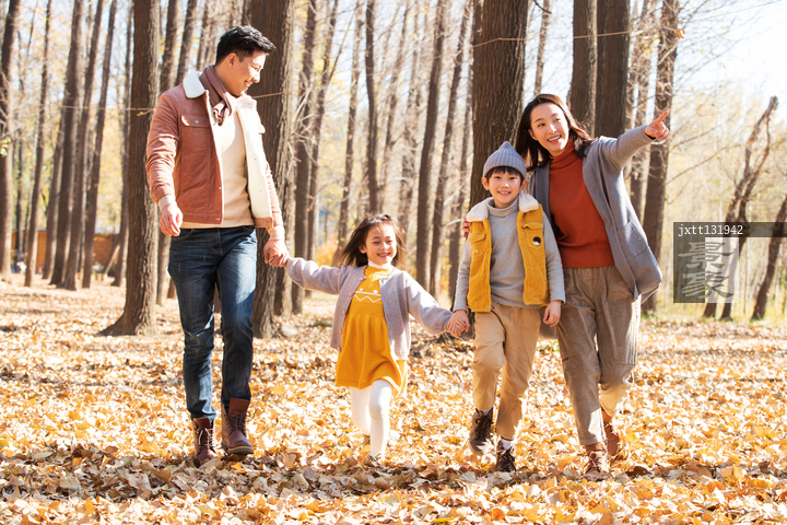 图片标题:     快乐家庭走在树林里