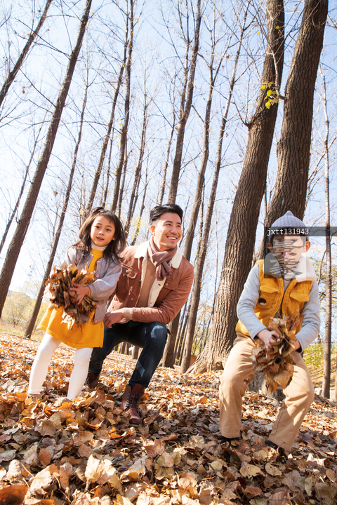 图片标题: 青年父亲带着孩子们在树林里玩耍
