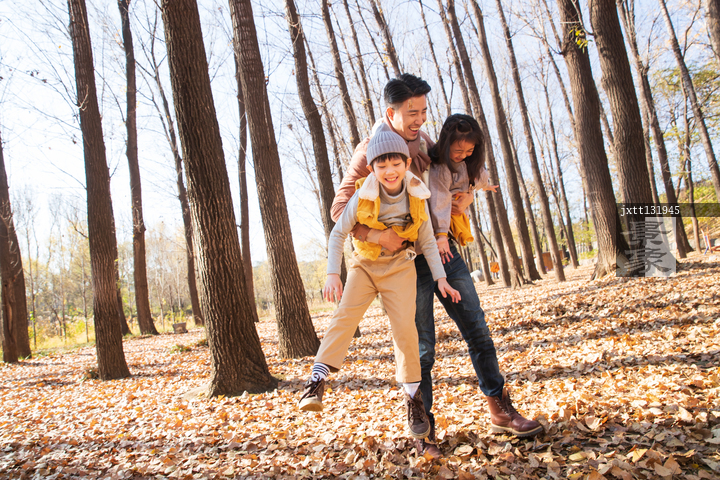 图片标题: 青年父亲带着孩子们在树林里玩耍
