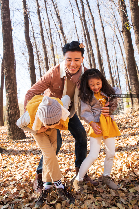 图片标题: 青年父亲带着孩子们在树林里玩耍
