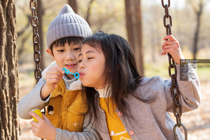 图片标题: 快乐儿童坐在秋千上吹泡泡
