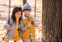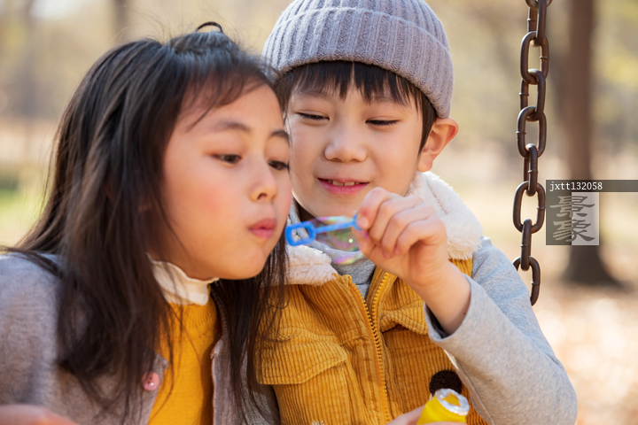 图片标题: 快乐儿童坐在秋千上吹泡泡