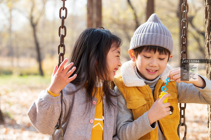 图片标题: 快乐儿童坐在秋千上吹泡泡