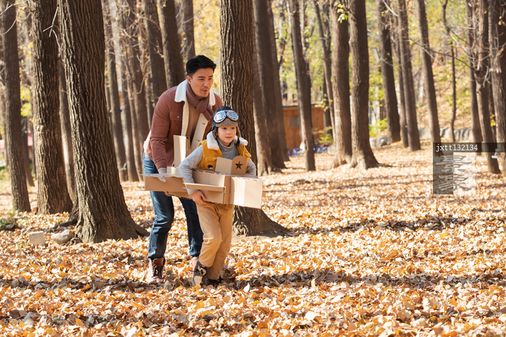 图片标题: 年轻父亲带着孩子玩飞机游戏