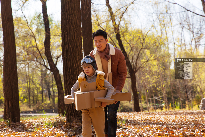 图片标题: 年轻父亲带着孩子玩飞机游戏