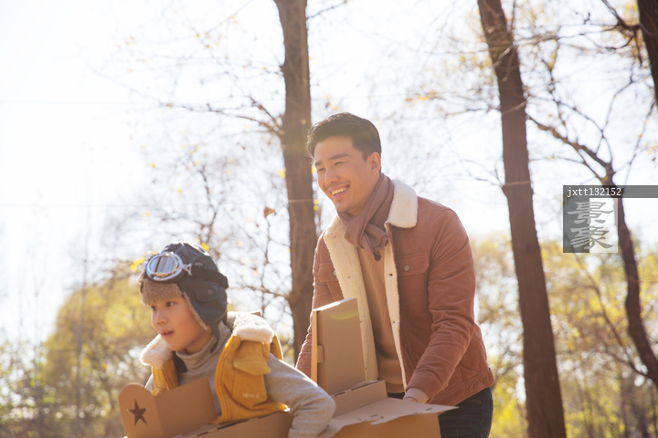 图片标题: 年轻父亲带着孩子玩飞机游戏