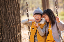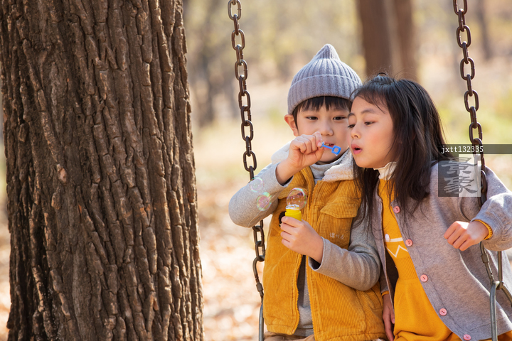 图片标题:     快乐儿童坐在秋千上吹泡泡