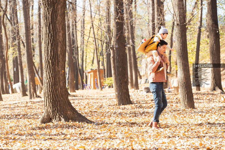 图片标题: 年轻父亲背着孩子玩飞机游戏