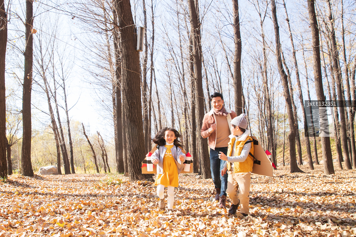 图片标题: 年轻父亲带着孩子们玩飞机游戏