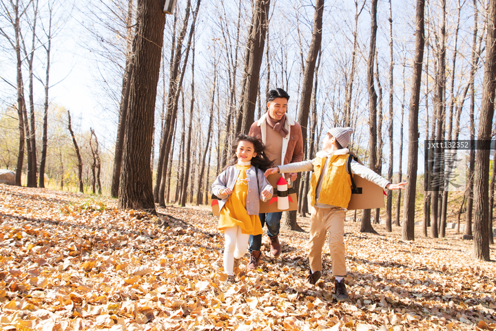 图片标题: 年轻父亲带着孩子们玩飞机游戏