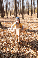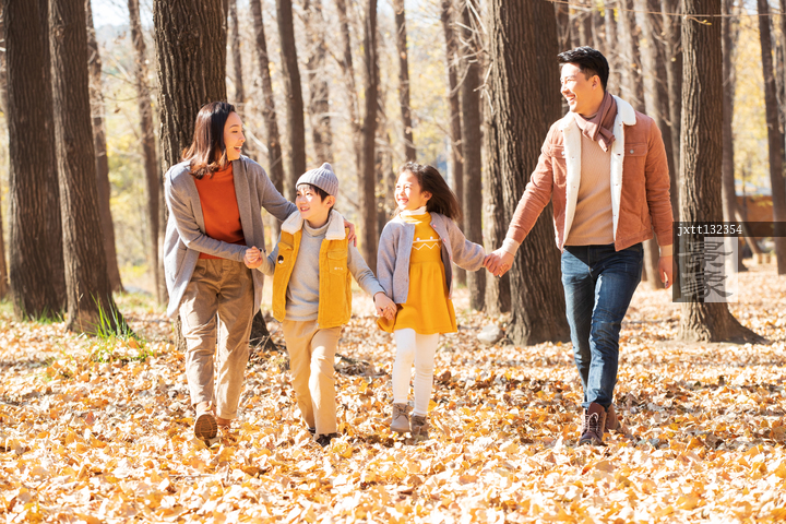 图片标题: 快乐家庭走在树林里